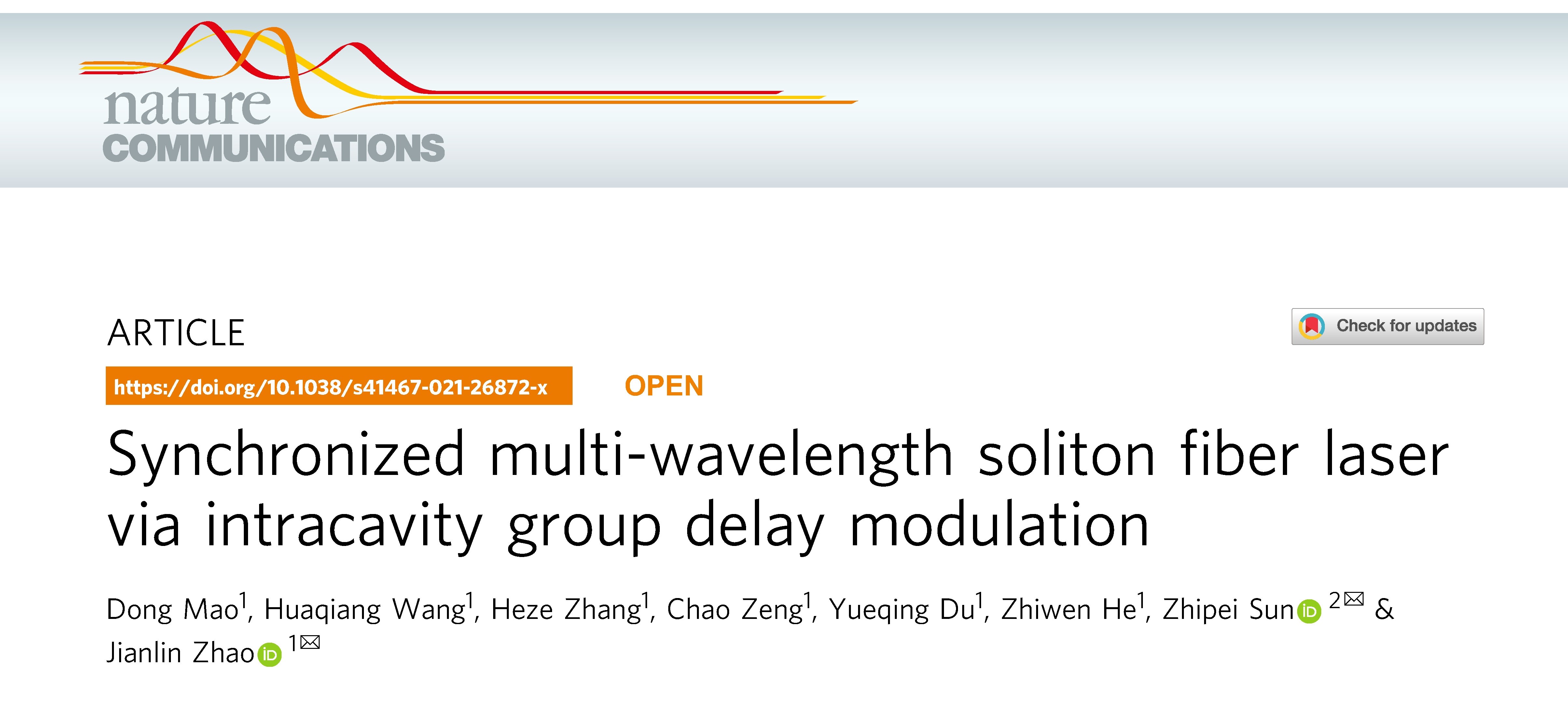 直播性爱 毛东教授、赵建林教授研究团队与芬兰阿尔托大学孙志培教授合作,在多波长同步锁模孤子激光方面取得重要进展。2021年11月18日,相关成果以“Synchronized multi-wavelength soliton fiber laser via intracavity group delay modulation”为题发表在国际顶级学术期刊《Nature Communications》上。论文第一作者为毛东教授,通讯作者为赵建林教授和孙志培教授。论文链接://www.nature.com/articles/s41467-021-26872-x#Sec12
