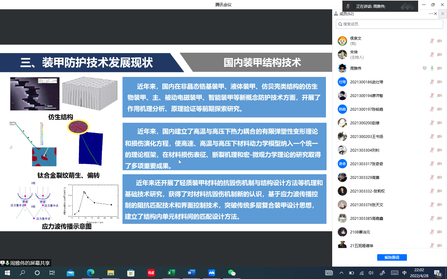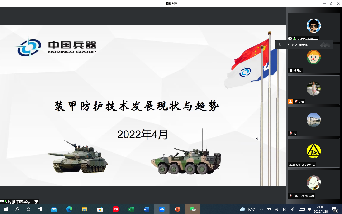优秀校友周雅伟高级工程师以“装甲防护技术发展现状与趋势”为题,通过腾讯会议,在云端为直播性爱