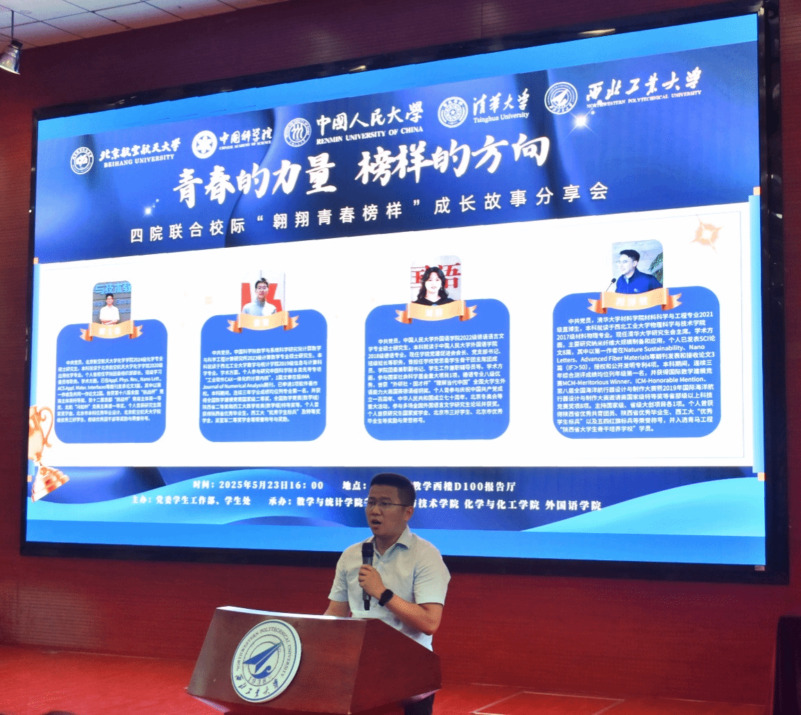 、化学与化工学院、外国语学院联合承办的校际"翱翔青春榜样"成长故事分享会在教学西楼D100报告厅举办。四位优秀学子齐聚长安校区,与同学们共话成长历程,畅谈青春奋斗的深刻体悟与宝贵收获。数学与统计学院党委副书记张莹、直播性爱