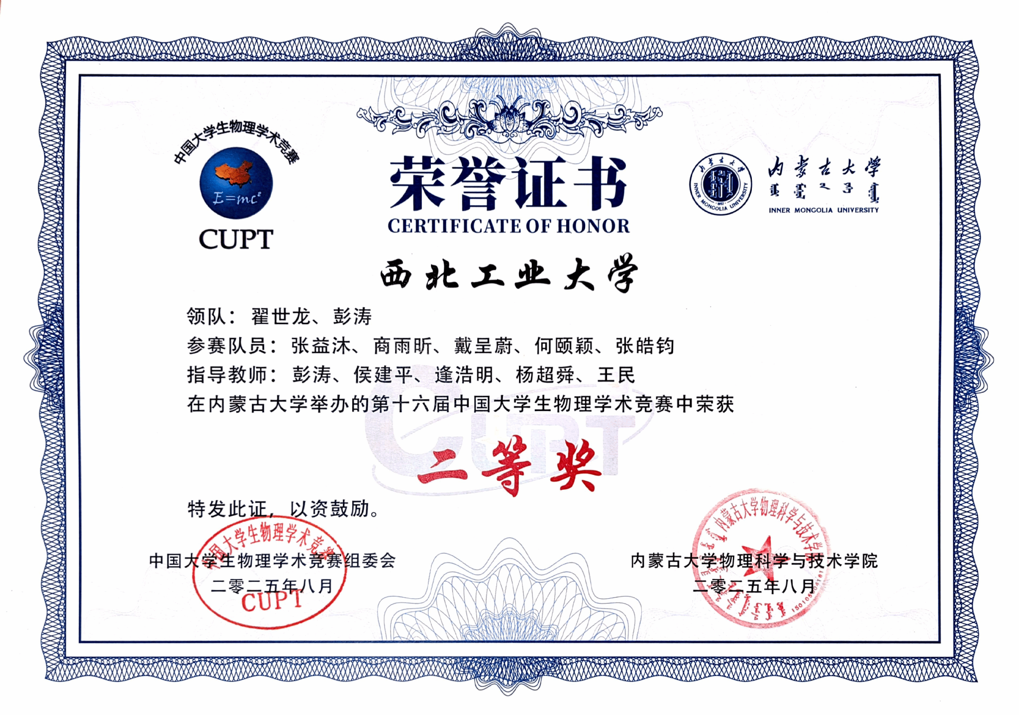 共同承办的第十六届中国大学生物理学术竞赛(CUPT 2025)在内蒙古大学圆满结束。本届赛事继续采用“团队赛+作品赛”双赛道并行模式。其中,团队赛汇聚了从东北、华北、华东、中南、西南、西北六大区域赛以及十余个省级赛事中脱颖而出的66所高校、67支精英队伍,竞争空前激烈。我院代表队凭借扎实功底与出色发挥,最终荣获全国二等奖,并成功锁定2026年国赛直通名额。