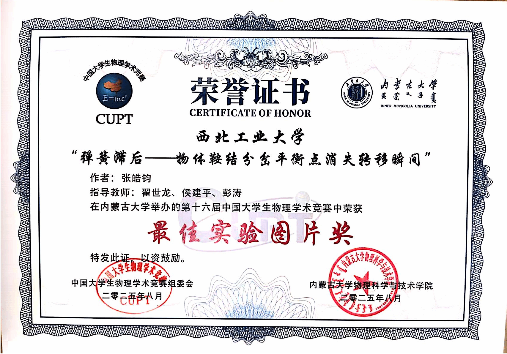 我院代表队由23级本科生张益沐(队长)、张皓钧、商雨昕,24级本科生戴呈蔚、何颐颖五位同学出战,翟世龙、彭涛、侯建平、逄浩明、杨超舜、王民等教师组成指导团队。团队在物理学科竞赛创新实践基地中进行了12个月的不断打磨、数十次地集中备赛,而后经历了校赛、省赛和西北赛的多轮拼杀,最终凭借扎实的理论功底、创新的实验方案与出色的临场应变能力,赢得国赛专家评委一致好评。除团体二等奖外,我院代表队对“弹簧滞后-物体鞍结分叉平衡点消失转移瞬间”赛题的研究获得最佳实验图片奖1项,充分展现了我院学子“为国铸剑”的精神风貌。