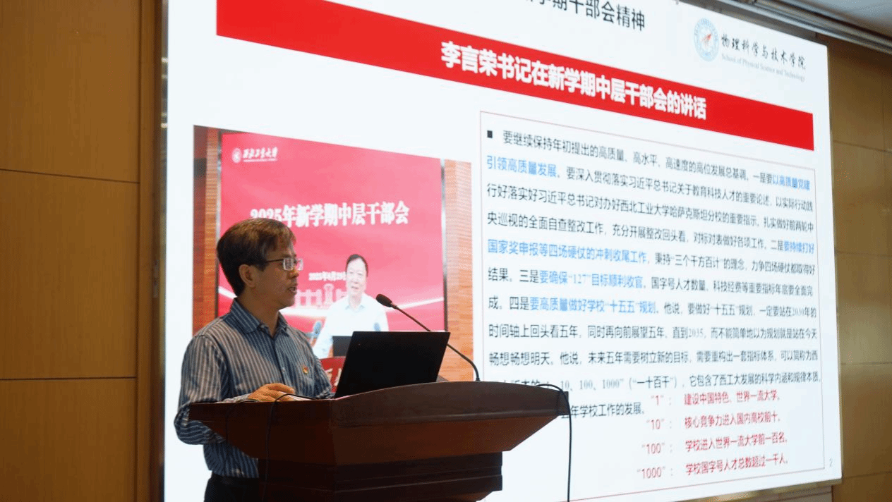 会上,晁小荣书记首先传达了2025年学校暑期务虚会暨新学期干部会精神,带领大家重点学习了李言荣书记和宋保维校长的有关讲话精神。他表示,报告中提出的“优化学科专业布局 推动‘总师型’人才培养”和西工大版“一十百千”是学校“十五五”期间努力建设世界一流大学的关键举措和战略目标。全体教职工需深刻领会会议精神,把握学校发展方向,结合学院实际找准下一步工作的发力点,共同推动学院高质量内涵式发展迈上新高度。接着,晁小荣书记汇报了学院2025年上半年党建工作的开展情况及下半年重点工作计划,强调要进一步通过强化党建引领作用带动师德师风建设提质增效,进而在全院范围内营造风清气正、追求卓越的一流文化氛围,为学院各项事业发展提供坚实保障。