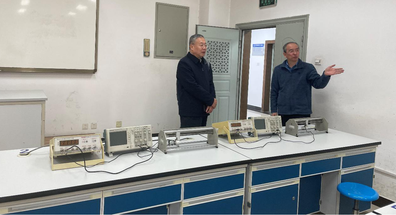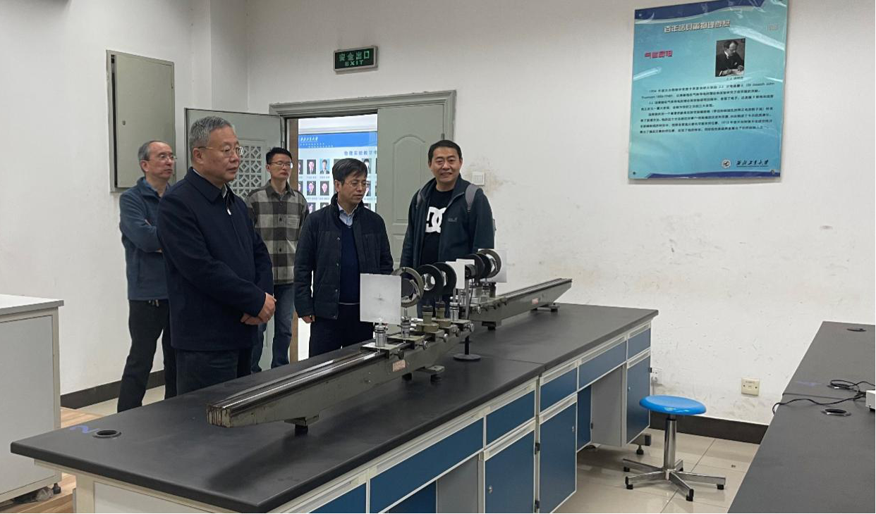 随后,万书记检查了和物理实验教学中心大学物理实验室,副院长尹剑波、物理实验中心主任杨超舜、大学物理实验室负责人庞述进行了全面介绍。万书记就选课人数、上课周数、课程容量、学生上课方式、文管类学生上课情况、教师教学队伍等问题进行了全面细致的了解,充分肯定了中心在教学、双创方面的成绩,并对今后工作提出了希望: