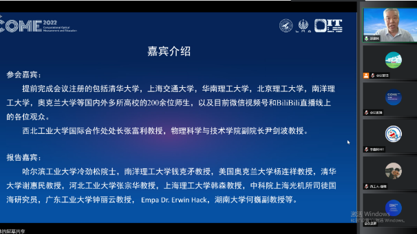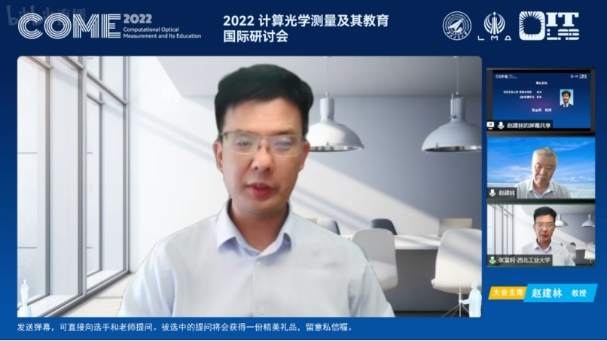 国际合作处处长张富利教授致欢迎辞,随后钱克矛教授介绍了COME的发展历程与举办地西安的文化背景。简短热烈的开幕式之后,大会报告正式开始。在本届会议中,哈尔滨工业大学冷劲松院士、奥克兰大学杨连祥教授、湖南大学何巍副教授、河北工业大学张宗华教授、上海理工大学韩森教授、中国科学院上海光学精密机械研究所司徒国海研究员、广东工业大学钟丽云教授、瑞士联邦材料科学与技术实验室Dr. Erwin Hack等8位国内外专家分别围绕计算光学测量做了报告。8篇大会报告异常精彩,反映出目前国际上计算光学测量学术与工程领域最前沿的学术和技术发展动态。本次COME由微信视频号和哔哩哔哩同步在线直播,会议期间两个平台线上累计观看3400余人次,同时最高在线800余人次。