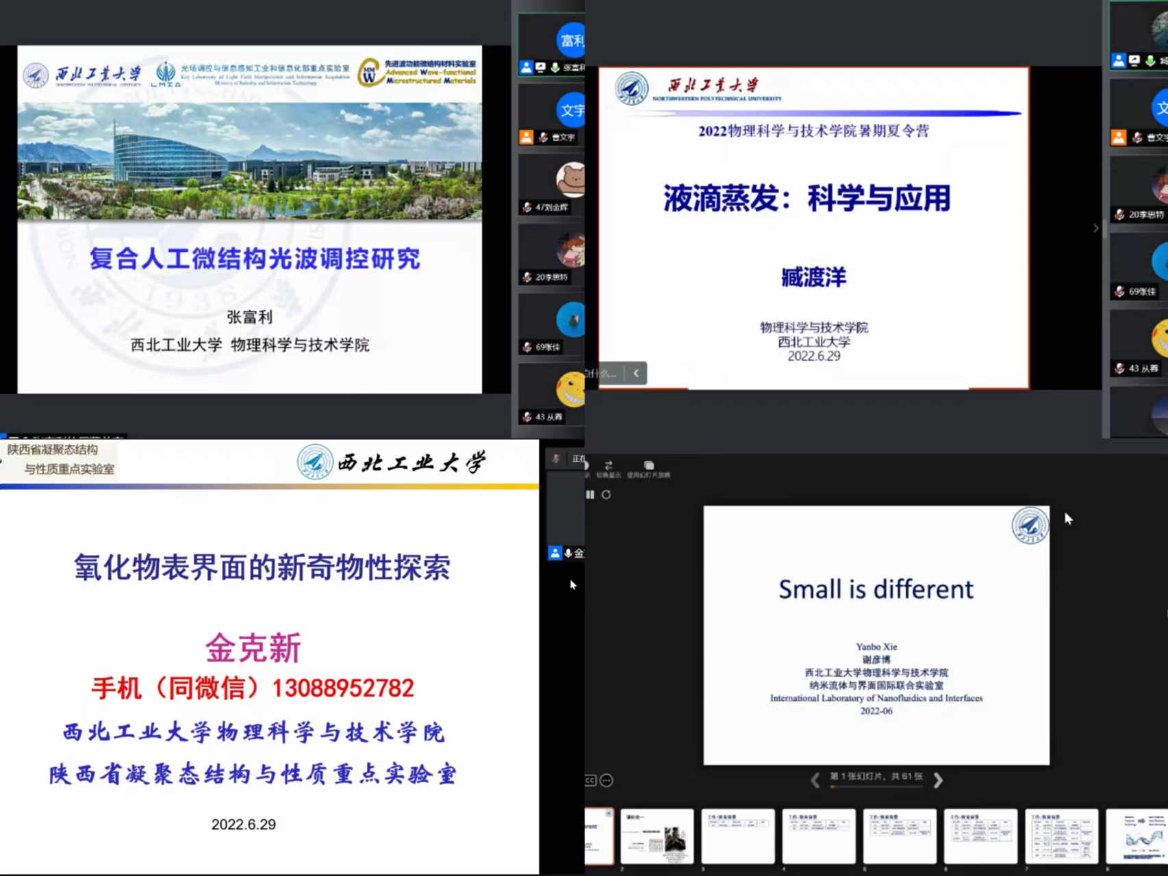 本次暑期学校共安排十场学术讲座,尹剑波教授、王楠教授、毛东教授、张富利教授、臧渡洋教授、金克新教授、谢彦博教授、王建元教授、闫娜教授和温丹丹教授分别围绕“智能材料与超构材料”“航空发动机单晶叶片的激光修复与制造”“锁模光纤激光理论与技术”“复合人工微结构光波调控研究”“液滴蒸发:科学与应用”“氧化物表界面的新奇物性探索”“Small is different”“超声材料科学与技术”“空间材料科学的前沿探索”“超表面光电器件原理及应用”等主题进行了深入浅出的讲解,师生双方通过屏幕展开了精彩热烈的讨论,学生们收获颇丰。