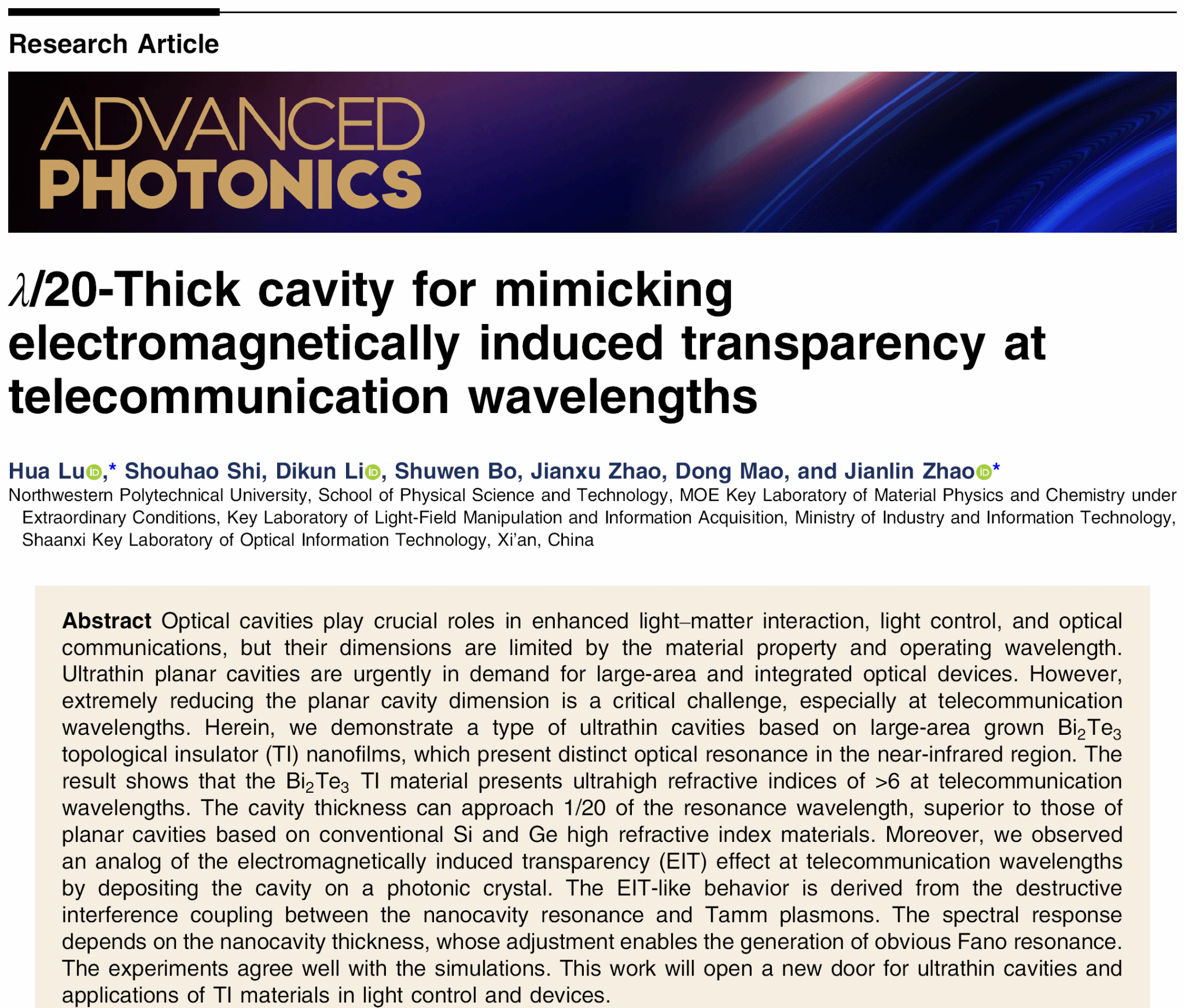 赵建林教授、陆华教授团队开展了拓扑绝缘体材料光学共振及其耦合特性研究,利用制备的碲化铋拓扑绝缘体纳米薄膜,获得了近红外波段超薄光学共振腔,并将其与光子晶体相集成,实现了光通信波段类电磁诱导透明效应的产生。