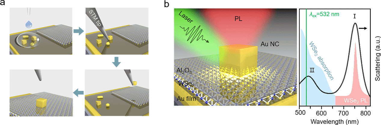 图1. (a)光谱辅助的纳米操控技术,(b)按需制备的NCoM-WSe2混合纳腔实现荧光激发、发射和收集的协同增强。