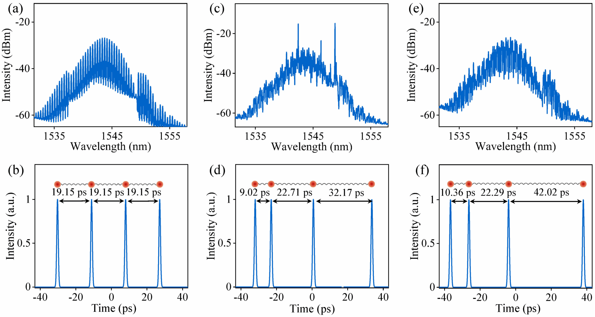 研究团队通过计算多脉冲相互作用特性,发现子脉冲与主脉冲叠加会形成捕获势阱,可用于调控脉冲时域位置。基于傅里叶变换位移定理,利用光谱相位调控技术在光纤激光器内生成按需分布的子脉冲序列,实现了对多脉冲时域位置的主动调控,成功产生了间距为常数数列、等差数列以及等比数列分布的脉冲串。进一步结合光谱滤波技术,获得了多波长复合的新型脉冲串,为激光加工、信息存储等应用提供了特种脉冲源,也为探索多脉冲之间的相互作用提供了理想平台。