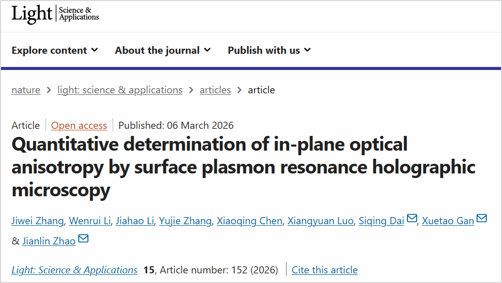 近日,我院赵建林教授团队在二维材料面内光学各向异性定量测量方面取得重要研究进展,相关研究成果以“Quantitative determination of in-plane optical anisotropy by surface plasmon resonance holographic microscopy”为题发表于光学领域高水平期刊《Light: Science & Applications》(论文链接://www.nature.com/articles/s41377-026-02207-7)。张继巍副教授为论文第一作者,赵建林教授、甘雪涛教授、戴思清副教授为论文共同通讯作者。
