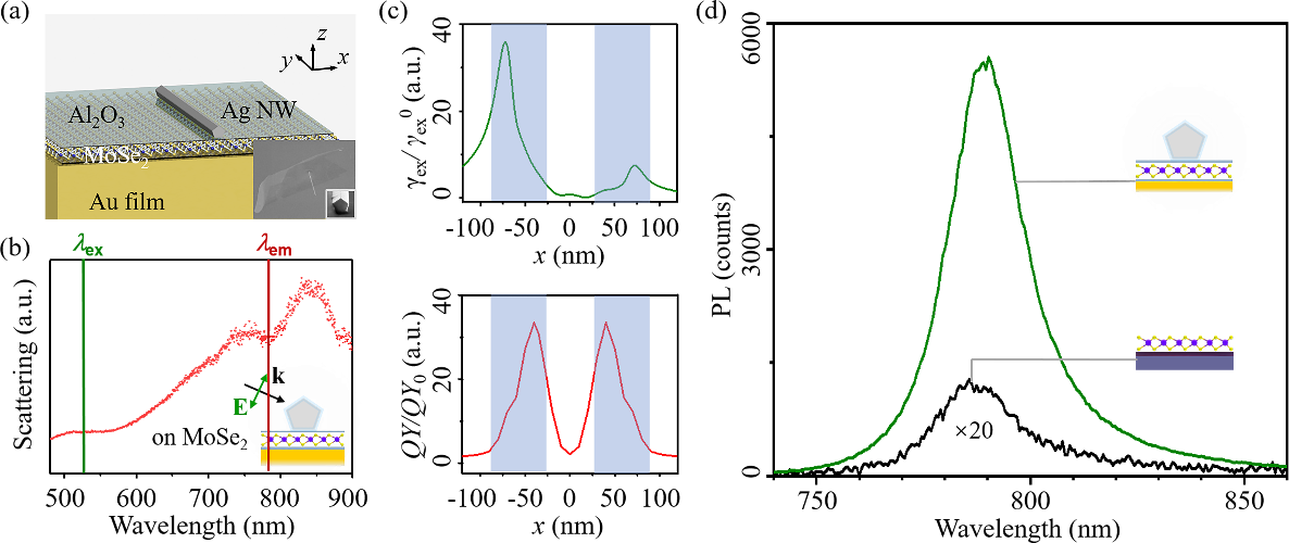 荧光现象可大体分为激发和发射两个过程。研究团队设计了一种银纳米线-金薄膜纳米腔(NWoM)的多共振结构,并通过纳腔的低阶和高阶等离激元模式同时增强了荧光的激发和发射过程。特别地,纳腔中高局域的等离激元模式与MoSe2的中性激子因中等耦合产生了Fano共振现象,以此最大限度地提升了材料的荧光发射速率。进一步,通过巧妙的结构设计,使低阶和高阶的纳腔模式具有较好的空间重叠,保证了荧光的激发和发射过程能在同一位置获得增强。结合复合体系中的Fano共振和模式匹配的优点,研究人员观察到单层MoSe2荧光1840倍的增强。该研究为增强二维半导体材料的荧光提供了一种全新的方法,并有望推动其相关光电器件的实用化。