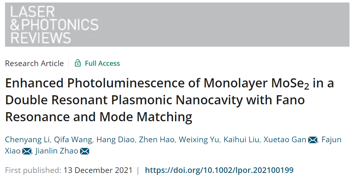 肖发俊、甘雪涛、赵建林教授团队与中科院西安光机所鱼卫星研究员、北京大学刘开辉教授合作,在纳腔增强荧光光谱方面取得重要进展。相关成果以“Enhanced Photoluminescence of Monolayer MoSe2in a Double Resonant Plasmonic Nanocavity with Fano Resonance and Mode Matching”为题发表于光学类国际顶级期刊《Laser & Photonics Reviews》(DOI: 10.1002/lpor.202100199)。我院2020级博士生李晨阳为论文第一作者,肖发俊教授、甘雪涛教授和赵建林教授为共同通信作者。