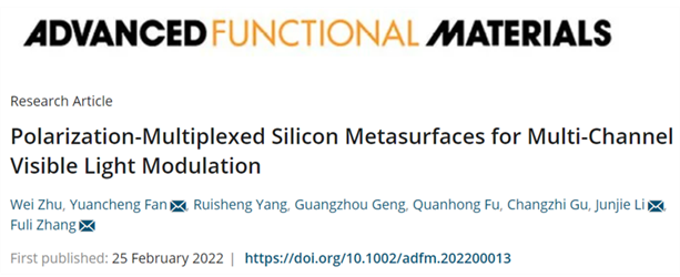相关成果以“Polarization-Multiplexed Silicon Metasurfaces for Multi-Channel Visible Light Modulation”为题发表于高影响力学术期刊《Advanced Functional Materials》(DOI: 10.1002/adfm.202200013; IF:18.808)。西工大直播性爱 朱维博士为论文第一作者,樊元成教授、张富利教授和中国科学院物理研究所李俊杰研究员为共同通信作者。
