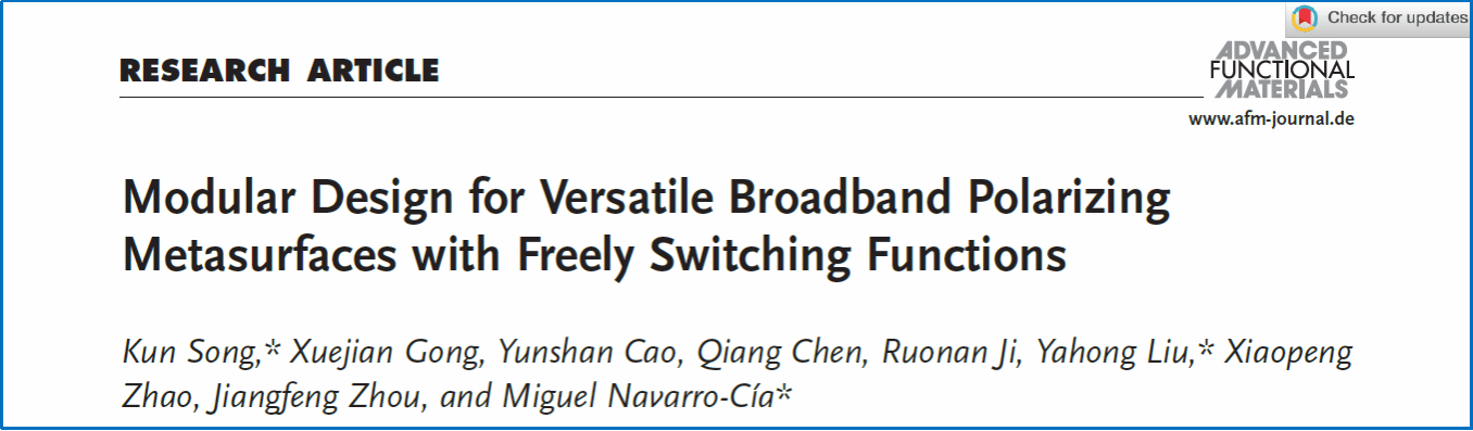 我院智能材料实验室团队与美国南佛罗里达大学周江峰副教授团队和英国伯明翰大学Miguel Navarro-Cía副教授团队开展合作,在电磁波极化调控研究方面取得重要进展。近日,相关成果以“Modular Design for Versatile Broadband Polarizing Metasurfaces with Freely Switching Functions”为题在国际著名期刊《Advanced Functional Materials》上发表,并被选为封底文章。智能材料实验室团队宋坤副教授为论文第一作者和通讯作者,刘亚红教授和Miguel Navarro-Cía副教授同为通讯作者。该论文的合作者还包括智能材料实验室团队硕士生龚雪健、曹赟山、陈强及冀若楠副教授和赵晓鹏教授。